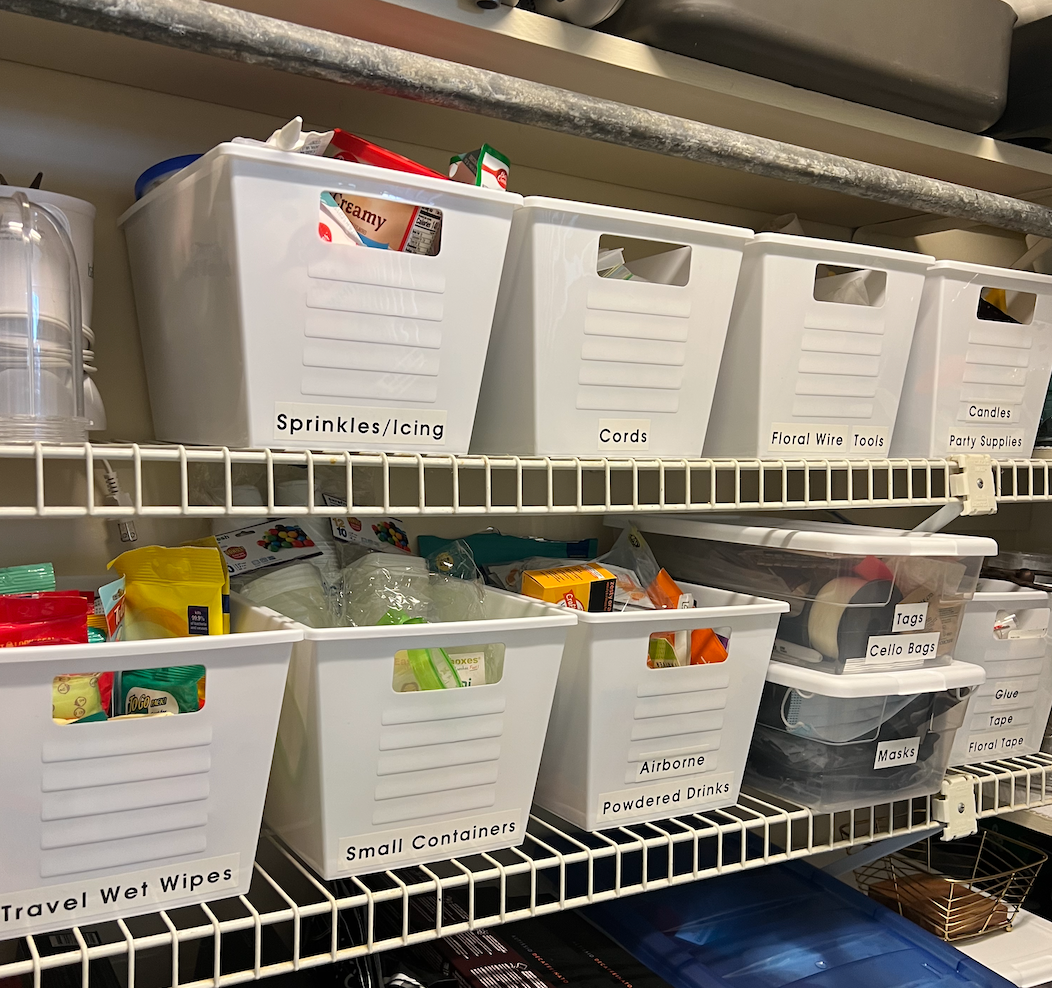 Kitchen pantry, countertops, dish shelves. My former office--with years of files on the floor. Clothes closets, bathroom closet and vanity. My husband's study and our son's room--"deconstructed." Amy prints labels, finds containers, even drops off items that you no longer need at places that can use them: a food bank, the Humane Society, a thrift store.